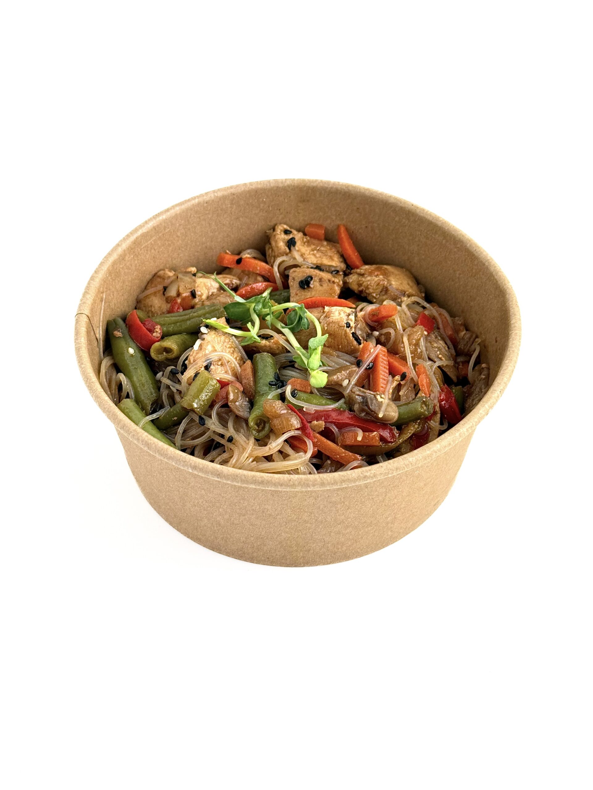 Склад: локшина теріякі, теріякі густий, локшина яєчна, кунжут ч/б, куряче м’ясо томлене, помідори