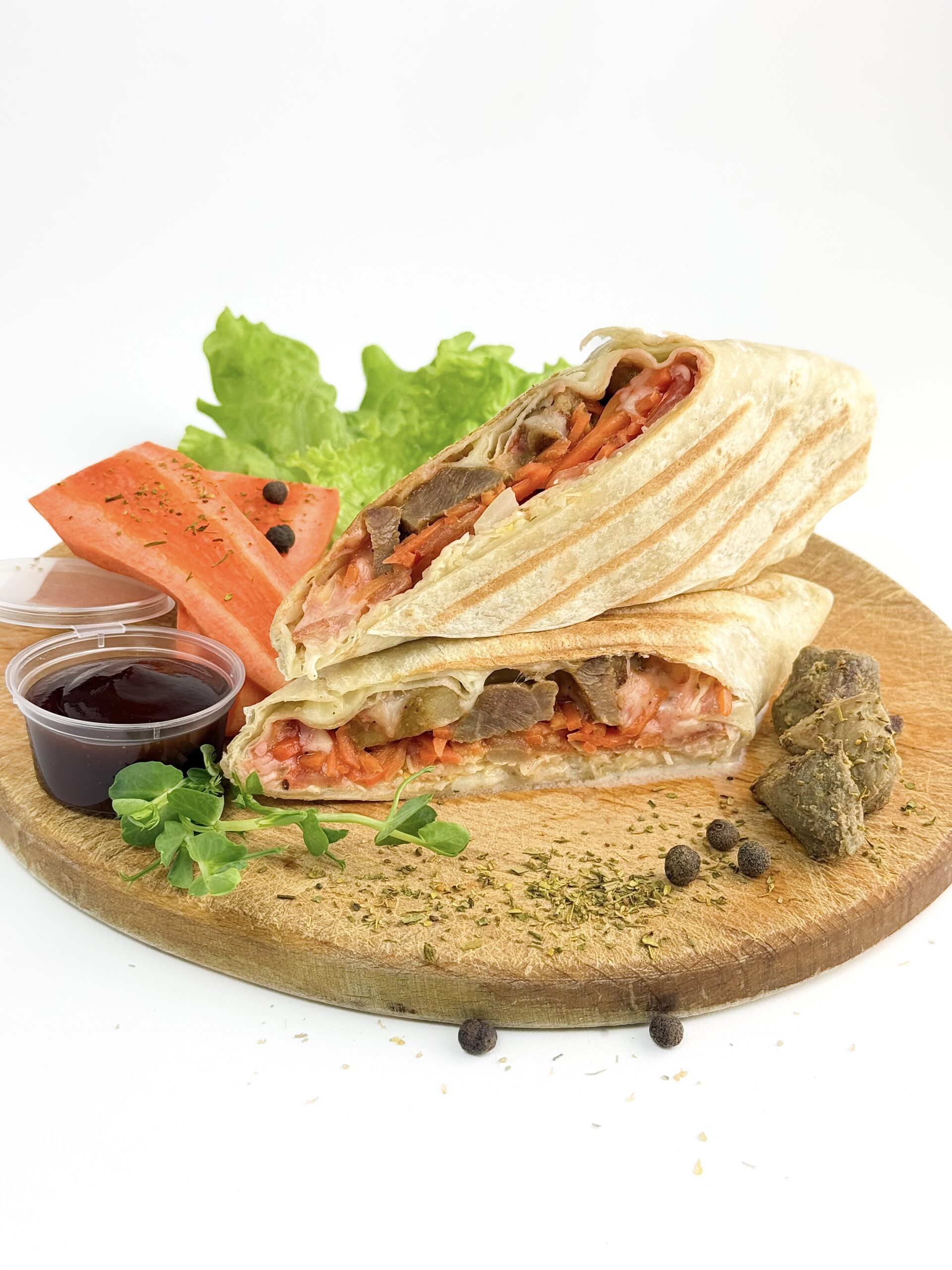 Склад: тортилья пшенична, капуста, морква, огірок, соус часниковий, свинина, цибуля, сир моцарела.